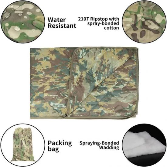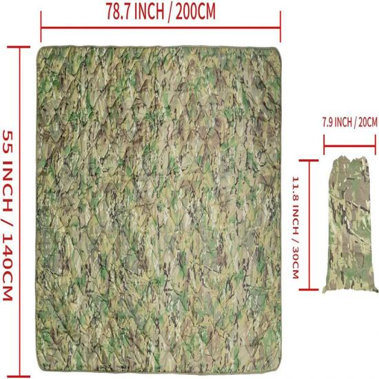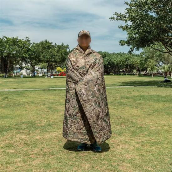 متعددة الأغراض: بالإضافة إلى استخدامها كبطانية مقاومة للماء ودافئة، يمكن أيضًا استخدام بطانية التمويه كبطانية للتخييم والأنشطة الخارجية، وسجادة للشاطئ، وسجادة للنزهة، وبونشو، والتصميم خفيف الوزن والمدمج يجعلها مفيدة في العديد من المناسبات.