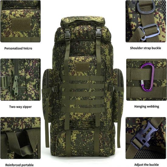 حقيبة الظهر هذه مصنوعة من قماش أكسفورد 900D المتين، مما يجعلها تتحمل الأحمال الثقيلة. بسعة 70 لترًا، تتسع لجميع أغراضك ومستلزماتك.