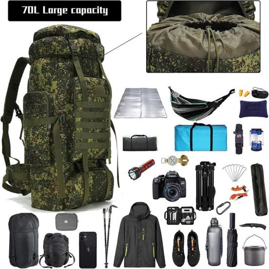 حقيبة ظهر مقاومة للماء والخدش بسعة 70 لترًا وبأسعار معقولة وجودة عاليةحقيبة الظهر هذه مصنوعة من قماش أكسفورد 900D عالي الجودة، وهو متين ويتحمل الأحمال الثقيلة. مصممة بأحزمة مريحة ولوحة خلفية مبطنة، مما يضمن أقصى درجات الراحة حتى عند حمل حمولات ثقيلة.