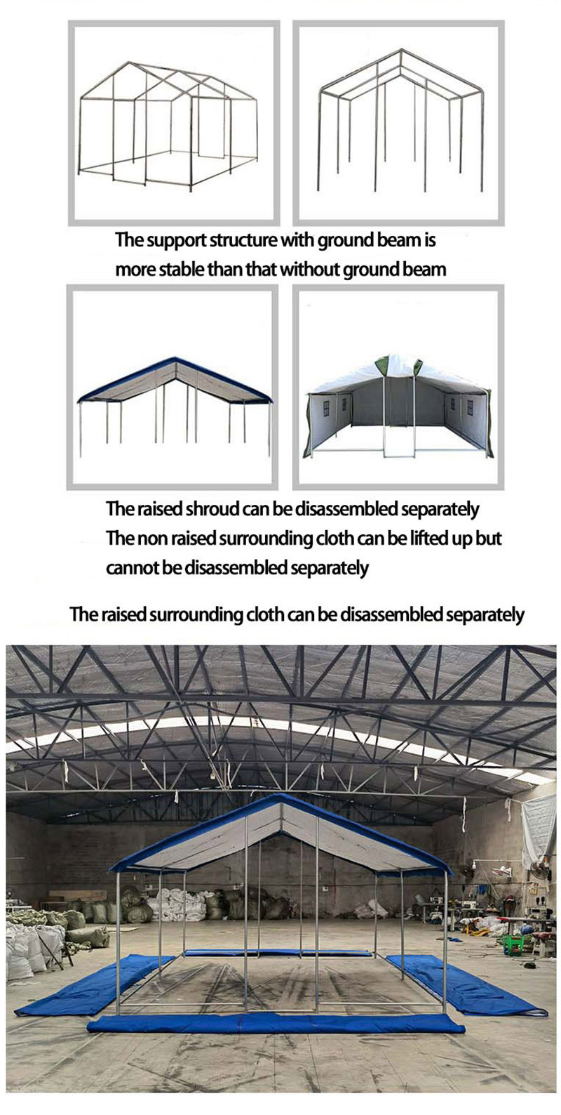 خيمة الطوارئ، أداة أساسية في العديد من الحالات الحرجة. في حالات الكوارث الطارئة، كما هو الحال بعد الأعاصير أو التسونامي، توفر هذه الخيمة مأوى فوريًا وآمنًا للمتضررين. تعتمد عليها الجيوش في معسكرات الانتشار السريع خلال المهمات. وتستخدمها الفرق الطبية كعيادات مؤقتة للإسعافات الأولية والعلاج. كما أنها عنصر أساسي في تبرعات الأمم المتحدة، والاحتياطيات الحكومية للتأهب للكوارث، وعمليات الصليب الأحمر. تتميز هذه الخيمة بتصميم سهل التركيب، مما يتيح تركيبها بسرعة حتى في أكثر الظروف إلحاحًا. علاوة على ذلك، تتوفر بمجموعة واسعة من الألوان، مما يتيح لك اختيار اللون الذي يناسب احتياجاتك الخاصة. يضمن تصميمها عالي الجودة المتانة والأداء طويل الأمد.