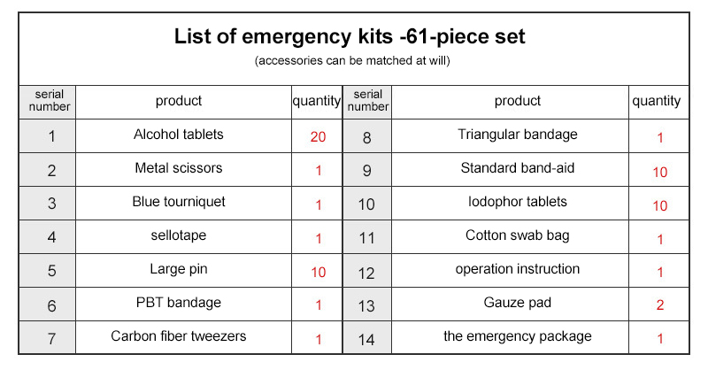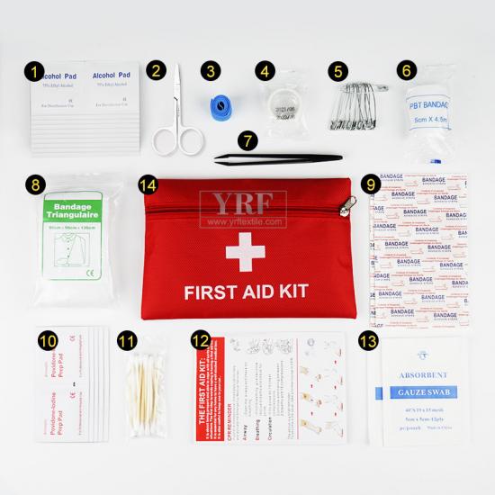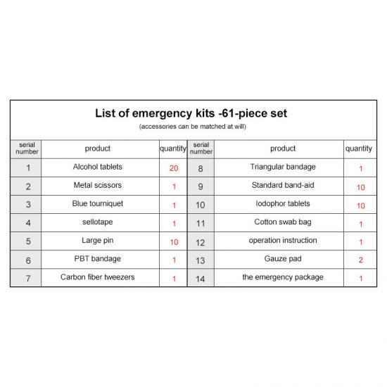 حقيبة إسعافات أولية مخصصة للمساعدات الإنسانية المدنية مكونة من 38 قطعة من قماش أكسفورد وحقيبة نجاة في حالات الطوارئالتالي :