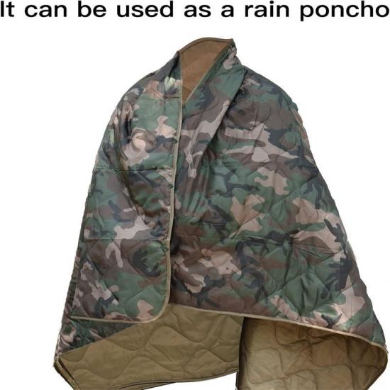تتميز البطانية بنمط تمويه على جانب واحد ولون كاكي غامق على الجانب الآخر. من حيث الأبعاد، يبلغ حجم بطانة البونشو الطارئة حوالي 55 × 78.7 بوصة وتزن 1.63 رطل مع كيس ضغط مطابق. يمكن تعبئة البطانية وضغطها بالكامل في كيس الضغط الخاص بها لسهولة الحمل والتخزين، مما يقلل المساحة والحجم.