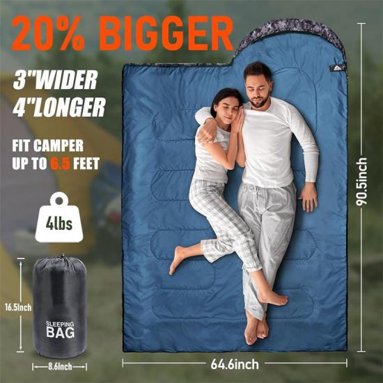 أبعاد كيس النوم العسكري بأسعار مخفضة (90.5 × 32.3 بوصة) تُوفر مساحة كافية لشخص واحد ليشعر بالدفء حتى في الطقس البارد. خامته السميكة وسعته الكافية تجعله خفيف الوزن، إذ يبلغ وزنه 6.6 رطل فقط. يأتي كيس النوم الفردي مع وسادتي نوم من إسفنج الذاكرة، مقاس 72.5 × 22 بوصة، لتجربة نوم دافئة ومريحة. بالإضافة إلى ذلك، يأتي كيس النوم العسكري بأسعار مخفضة مع كيس ضغط وشريط مطاطي قابل للضغط لسهولة التخزين والحمل.