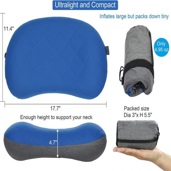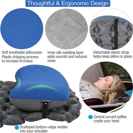 تم تصميم الوسائد القابلة للنفخ Earthquake Disaster Ready بتصميم مريح، بما في ذلك لوحة مركزية غائرة للدعم الثابت حسب وضع الرأس، وحافة سفلية مموجة لتناسب الرقبة وتلف حول الكتفين لدعم مريح.