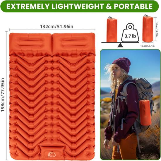 يبلغ مقاس وسادة النوم المزدوجة القابلة للنفخ 78 × 52 × 3.5 بوصة / 198 × 132 × 9 سم ويزن 3.7 رطل / 1.6 كجم فقط.