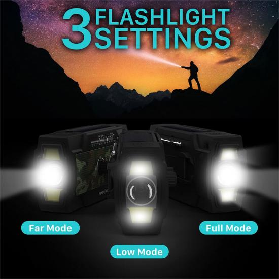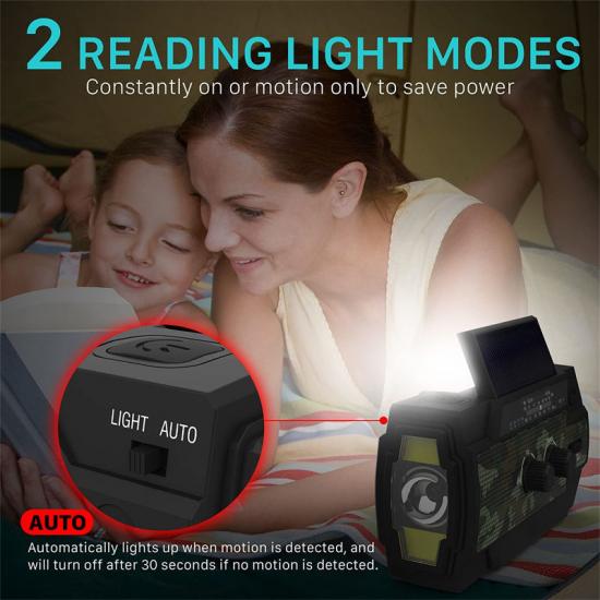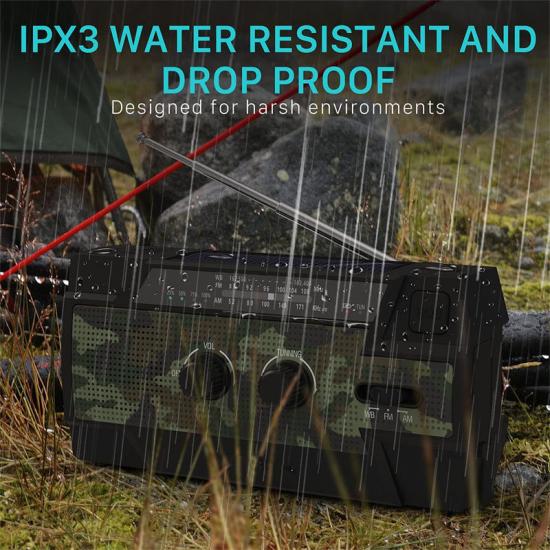 جهاز راديو طوارئ متعدد الوظائف. مزود ببطارية مدمجة بسعة 2000 مللي أمبير/ساعة، يوفر راديو الطوارئ طاقة طوارئ لأي جهاز لوحي أو هاتف محمول صغير، ويستقبل بدقة أحدث توقعات الطقس الطارئة ونشرات الأخبار الطارئة من محطات راديو الإدارة الوطنية للمحيطات والغلاف الجوي (NOAA) وAM/FM. كما يوفر راديو كرانك 4 مصابيح LED ومصباحًا يدويًا بقوة 1 واط لتوفير طاقة كافية لإبقائك أنت وأحبائك بعيدًا عن الظلام في حالات الطوارئ.