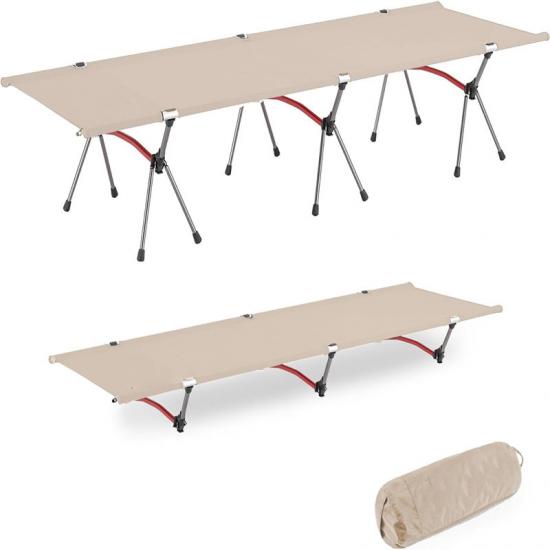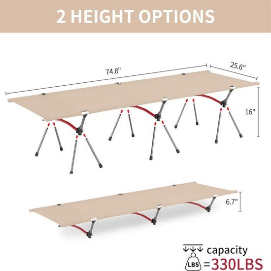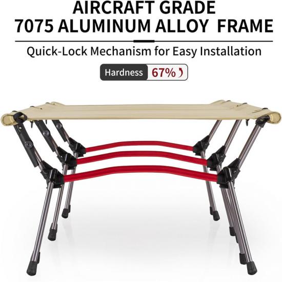 سرير الطوارئ المحمول القابل للطي لدينا مُجهّز بمجموعة متنوعة من الوظائف العملية. أولًا، يتوفر بخيارين للارتفاع: الارتفاع المنخفض (17 سم/6.7 بوصة) مناسب للاستخدام في الخيام أو على الأراضي الصلبة، بينما الارتفاع العالي (40 سم/15.7 بوصة) مناسب للاستخدام على الأراضي العشبية والموحلة والرطبة، وهو مصمم للتكيف مع جميع أنواع التضاريس الصعبة، ويضمن لك نومًا هانئًا وهادئًا. ثانيًا، يتميز السرير بنظام قفل سريع يُسهّل فتحه وقفله بيد واحدة لمزيد من الراحة. بالإضافة إلى ذلك، السرير مُجهّز بأنابيب حبلية لامتصاص الصدمات، مما يُعزز ثباته، ويُسهّل عملية التركيب والفك ويجعلها أقل جهدًا.