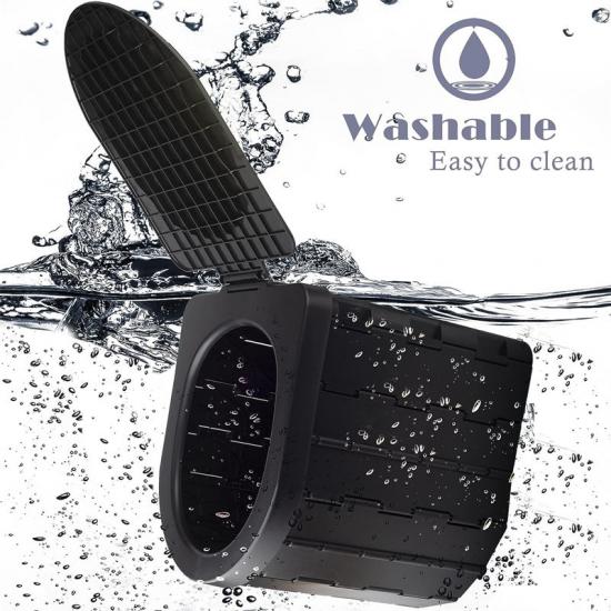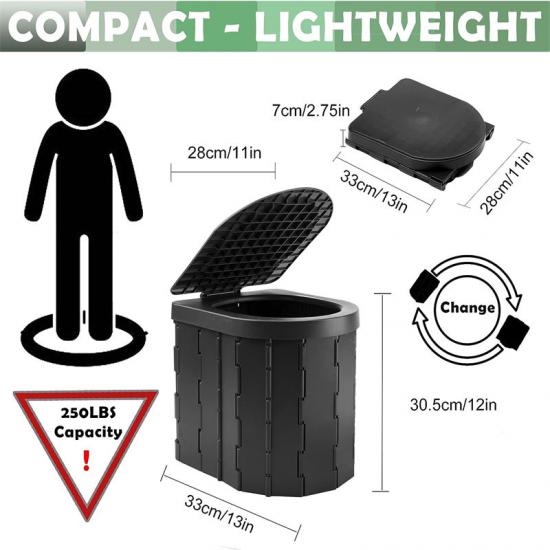 هذا المرحاض المحمول مصنوع من بلاستيك صلب بيضاوي الشكل ومتين، ويزن 1.5 كجم فقط، وهو خفيف الوزن للغاية. عند طيه، تبلغ أبعاده 31 × 28 × 30.5 سم (12 × 11 × 12 بوصة)، وحجمه الصغير يجعله سهل الحمل. عند فتحه، يبلغ ارتفاعه 30.5 سم (12 بوصة)، وتصميم الفتحة كبير بما يكفي لسهولة الاستخدام، كما أن عملية الفتح والتركيب بسيطة.