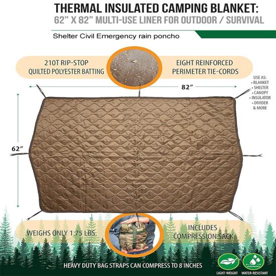 وظيفة: لا توفر بطانة معطف واق من المطر المصنوعة من البوليستر والقطن الدفء والحماية من معظم عناصر الطقس بالإضافة إلى درجة الحرارة فحسب، بل يمكن استخدامها أيضًا كخيمة بقاء مؤقتة سريعة الجفاف، أو مظلة، أو عزل أرجوحة، أو وسادة، أو قسم خيمة، أو شاشة خصوصية، أو أداة حمل طارئة، أو إغاثة من الكوارث، أو مخبأ مخفي، أو حقيبة يد، أو كيس نوم أو عزل خيمة.