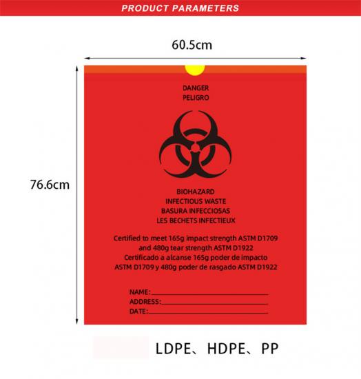 مادة البولي إيثيلين عالية الجودة: مصنوع من مادة البولي إيثيلين عالية الكثافة (HDPE) الطبية، بكثافة 0.95 جم / سم مكعب، وسمك 0.07 مم، وقوة الشد ≥ 34 ميجا باسكال، ومقاومة للثقب ≥ 320 جم، ومتانة جيدة للمواد، ولا يتلف بسهولة، مما يوفر ضمانًا موثوقًا به للتخزين المؤقت للنفايات الطبية.
