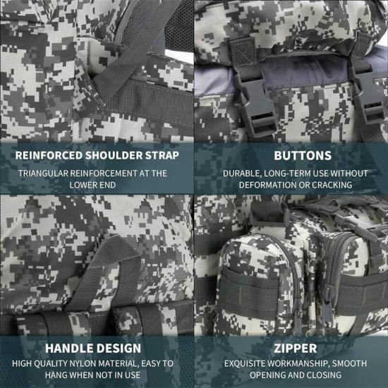 حقيبة الظهر العسكرية متينة وخفيفة الوزن ومتينة ومقاومة للماء، مع ميزات مقاومة للتمزق، مما يجعلها مثالية لأي مغامرة. حقيبة الظهر مصنوعة من مواد عالية الجودة يمكنها تحمل البيئات القاسية والاستخدام الكثيف.