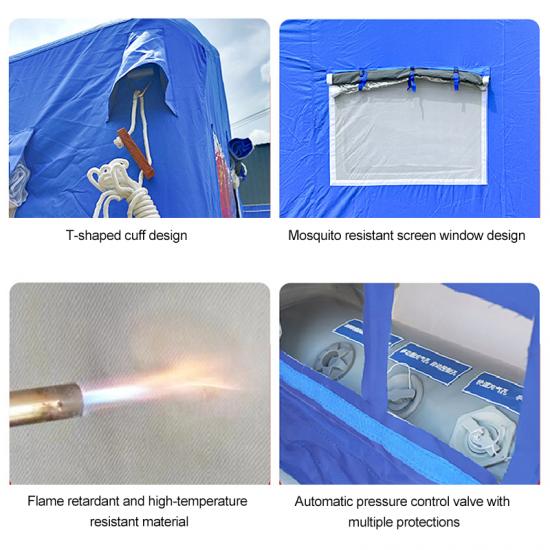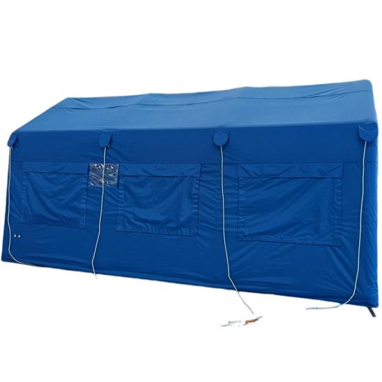 خيمة الطوارئ ذات المساحة الكبيرة هذه مصممة خصيصًا للمستوطنات واسعة النطاق بعد الكوارث، باستخدام هيكل دعم عمود الهواء المقوى بسمك 25 سم، مما يخلق مساحة مأوى واسعة ومستقرة. تتراوح مواصفات الخيمة من 8 × 10 م إلى 15 × 40 م، وحدة واحدة كحد أقصى تستوعب 100 شخص يعيشون أو 200 شخص مأوى مؤقت. باستخدام نسيج أكسفورد 820D من الدرجة العسكرية، تصنيف مقاومة الماء 4000 مم، مستوى مقاومة الرياح 9. يحافظ تصميم تخطيط عمود الهواء المقوى الخاص على ثبات الهيكل عند تحمل قوة الرياح الجانبية، وأعمدة الهواء غير متداخلة، ولا يؤثر الضرر في نقطة واحدة على الهيكل العام. الخيمة مجهزة بنظام تقسيم معياري، يمكن تقسيمه إلى وحدات معيشة مستقلة وفقًا للاحتياجات الفعلية. يختلف الوزن الإجمالي حسب المواصفات، وتتطلب أصغر مواصفات تعاون 6 أشخاص لإكمال التركيب في حوالي 35 دقيقة. يمكن التعرف على الجزء الخارجي الأزرق بسهولة في الإنقاذ الجوي، وتم تطبيقه بنجاح في العديد من الكوارث الكبرى.