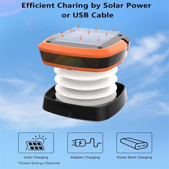 صُنع هيكل مصباح الطوارئ القابل للطي من الخدمات الطبية من قماش متين ومقاوم للماء لضمان استقراره في مختلف البيئات الخارجية. يحتوي المصباح الشمسي على لوحة شمسية عالية الجودة تُشحن بالطاقة الشمسية، بالإضافة إلى منفذ USB يُمكّنك من شحنه عبر كابل USB، والذي يُمكن شحنه بالكامل في غضون ساعتين تقريبًا. كما يحتوي مصباح الطوارئ الخفيف من الخدمات الطبية على بطارية ليثيوم مدمجة بسعة 1200 مللي أمبير/ساعة، يُمكن استخدامها كمصدر طاقة طوارئ لشحن الهواتف المحمولة وأجهزة الاتصال الأخرى.