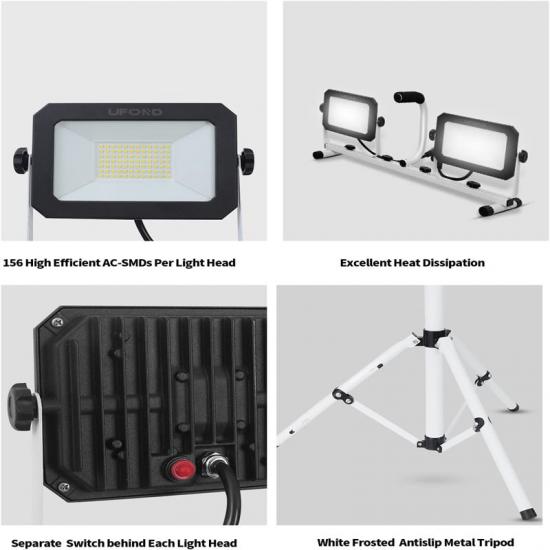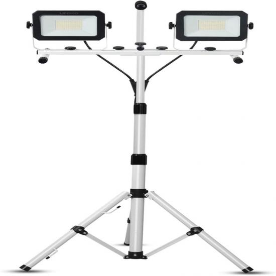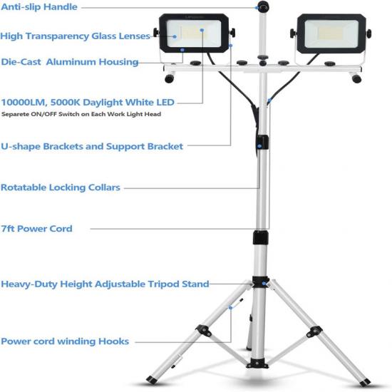 مصباح الطوارئ مزود بسطوع ٥٠٠٠ لومن لكل غطاء، وضوء أبيض وامض ٥٠٠٠ كلفن. يمتد حامل ثلاثي القوائم التلسكوبي من ٣٣ إلى ٧٠ بوصة. يمكن تدوير كل رأس ٣٦٠ درجة أفقيًا و٢٧٠ درجة رأسيًا لضبط زاوية الإضاءة المطلوبة. يمكن فصل مصباح العمل ثنائي الرأس المزود بمقبض للاستخدام بشكل مستقل، مما يُغني عن استخدام حامل ثلاثي القوائم.