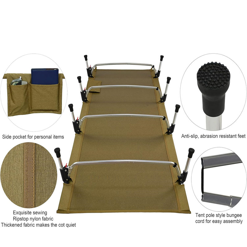 يستخدم كسرير قابل للطي معزز لإنقاذ الزلازل، تصميم السرير القابل للطي الحامل للوزن على شكل مثلث على شكل X يوفر مساحة راحة آمنة حتى على الأرض غير المستقرة وحواف الأنقاض، سرير الإنقاذ الذي يتحمل حمولة عالية تبلغ 165 كجم يدعم أفراد الإنقاذ الذين يستريحون مع معدات الكسر، سرير الإنقاذ الأخضر العسكري منخفض الرؤية لا يمكن اكتشافه بسهولة في المناطق ذات الهزات الارتدادية المتكررة، مما يقلل من خطر الإصابة الثانوية.