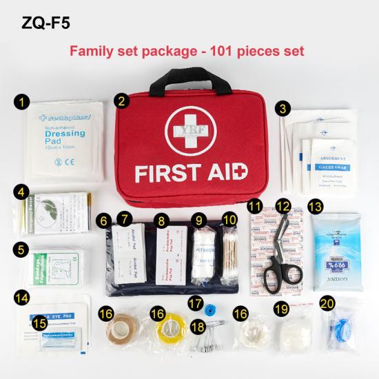ضمادة وقف النزيف *2، مجموعة الإسعافات الأولية الطبية *1، ضمادة شاش (ثلاثة أحجام) *6، بطانية إسعافات أولية *1، ضمادة مثلثة *1، كيس جل ساخن وبارد *1، أقراص كحول *20، أقراص يودوفور *20، ضمادة بولي بيوتيلين *1، كيس مسحة قطنية *1، ضمادة لاصقة مقاومة للماء *25، مقص *1، مناديل مطهرة بالكحول *1، ضمادة عين *2، مرهم مضاد حيوي ثلاثي *1، ضمادة لاصقة *3، عاصبة يمكن التخلص منها *1، دبوس أمان *10، قفازات يمكن التخلص منها *1، قناع إنعاش قلبي رئوي يمكن التخلص منه *1، تعليمات الاستخدام *1