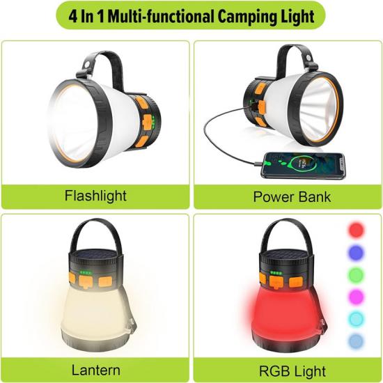 مصباح LED للطوارئ مصنوع من مادة ABS+PP من الخارج، مقاوم للماء IPX65، ومقاوم للحرارة، ومقاوم للصقيع، واستخدام بدون قلق في البيئات القاسية. 1500 لومن، 8 أوضاع إضاءة، بطارية مدمجة 7200 مللي أمبير في الساعة، يمكن استخدامها كمصدر طاقة محمول لشحن الهواتف المحمولة والأجهزة الأخرى.