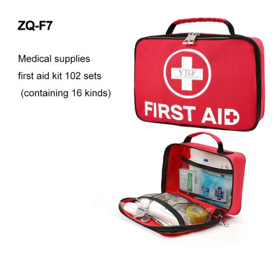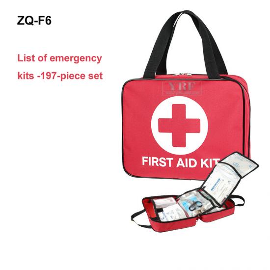 ضمادة شاش (مقاس 2) *4، ضمادة عين *2، أقراص يودوفور *100، مجموعة طوارئ *1، ضمادة جروح *20، كيس مسحة قطنية *2، كيس ثلج *1، شريط بولي بروبيلين تيرفثاليت *4، قناع N5 *5، مقص *1، أقراص كحول *50، مناديل مبللة مطهرة *1، قفازات من البولي فينيل كلوريد *2، ضمادة مثلثة *2، بطانية إسعافات أولية *2