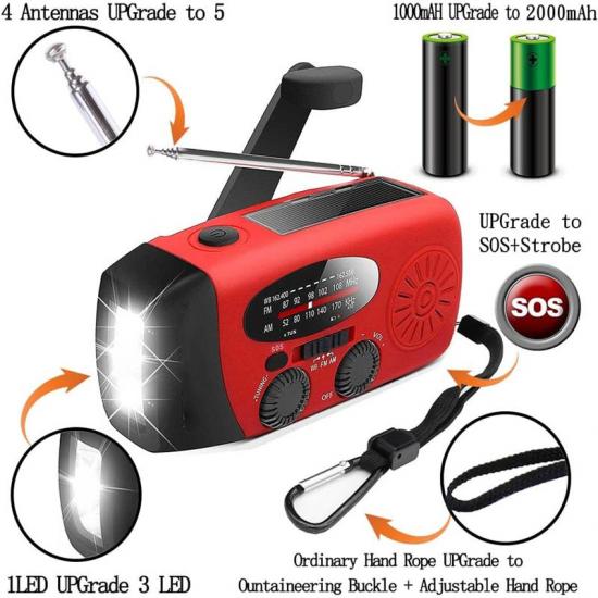 توفر إمدادات الصليب الأحمر الراديوية 7 قنوات من توقعات الطقس في الوقت الحقيقي مثل الزلازل والأعاصير والزوابع والعواصف الشديدة. توفر وحدة إمداد الطاقة المحمولة 2000 مللي أمبير في الساعة طاقة طوارئ كافية لأي جهاز محمول في حالة الطوارئ، ومصباح طوارئ مدمج 3 LED وشريحة إنذار SOS، والضغط لفترة طويلة على SOS لمدة ثلاث ثوانٍ يمكن أن يرسل إشارة استغاثة دولية.