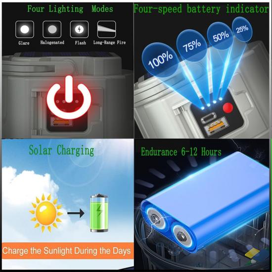 ج: يدعم مصباح الطوارئ الخفيف والمخصص للإنقاذ طريقتي شحن: الطاقة الشمسية والشحن عبر USB. في حالات الطوارئ، يمكن استخدامه كمصدر طاقة متنقل.