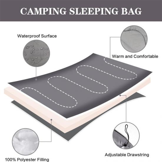 يعتبر طلاء سطح كيس النوم المصنوع من البوليستر المصنوع من القماش المقاوم للتمزق مركبًا جزيئيًا جافًا مقاومًا للماء والتهوية ومقاومًا للرطوبة، مما يجعله صامدًا جيدًا في الطقس الممطر أو المترب.