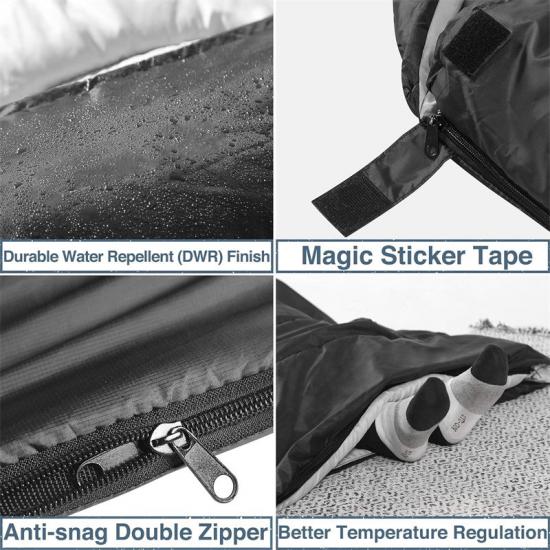 يوفر غطاء الرأس المزود برباط قابل للتعديل عزلًا أفضل ويدفئ الرأس. تم تصميم الجزء السفلي من كيس النوم المصنوع من النايلون من الأمم المتحدة بسحاب يسمح لك بتمديد قدميك عندما يصبح الجو حارًا جدًا، مما يجعل كيس النوم الخاص بنا مرنًا في تعديل درجة الحرارة لسيناريوهات الاستخدام المختلفة.