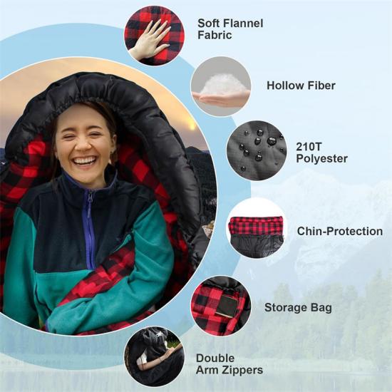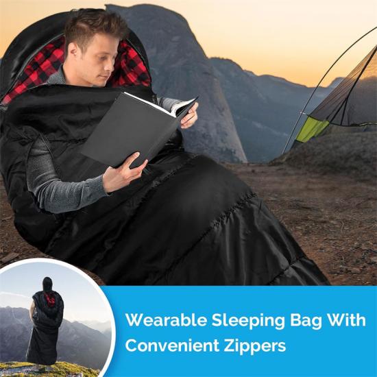 بالإضافة إلى ذلك، تم تصميم عناصر التصميم الإضافية لحقيبة النوم المضادة للتمزق للتخفيف من حالات الطوارئ، مثل القلنسوات القابلة للارتداء، والأصفاد ذات السحاب، وتصميم السحاب السفلي، وأشرطة الفيلكرو، والشرائط الواقية من الرياح، جميعها لتوفير الراحة والحماية المثالية لمساعدتك في الحصول على قسط كامل من الراحة في أي موقف.