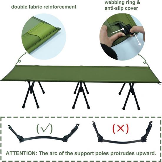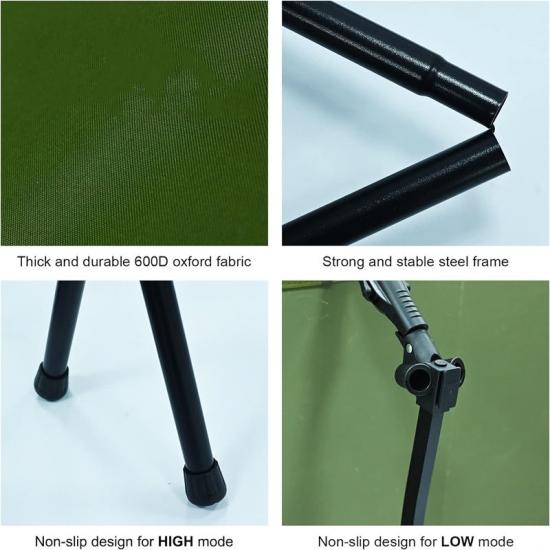 مع وضعين للارتفاع، يمكن ضبط السرير القابل للطي المحمول على ارتفاعين مختلفين، 18 سم و38 سم، لتلبية احتياجاتك المختلفة. إعداد الارتفاع 18 سم أقرب إلى الأرض، مما يوفر سطح نوم أكثر استقرارًا؛ بينما يوفر إعداد الارتفاع 38 سم عزلًا وتهوية أفضل.