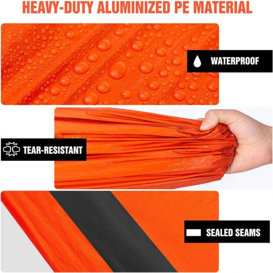 بالإضافة إلى استخدامها كحقيبة نوم للطوارئ، يعمل جانبها البرتقالي أيضًا كإشارة استغاثة، حيث يُظهر لونها المميز لطائرات الإنقاذ المروحية من مسافة بعيدة، مما يُساعد المنقذين على تحديد موقعها بسرعة. هذا التصميم متعدد الاستخدامات يجعل حقيبة النوم هذه مناسبة ليس فقط للحياة اليومية، بل أيضًا للأنشطة الخارجية والمغامرات.