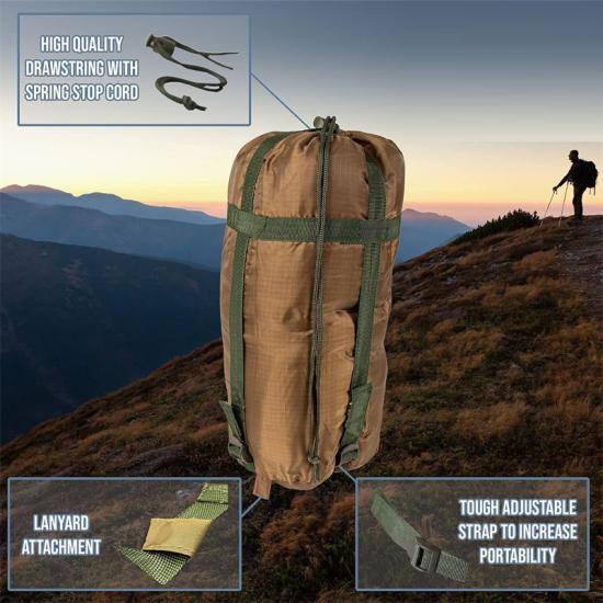 حجم بطانة البونشو المقاومة للماء: يبلغ طول بطانة البونشو حوالي 62 بوصة وعرضها 82 بوصة وتزن حوالي 1.75 رطل في كيس الضغط. تتضمن حقيبة مبطنة مضغوطة على الطراز العسكري لتوفير المساحة وتقليل الحجم.