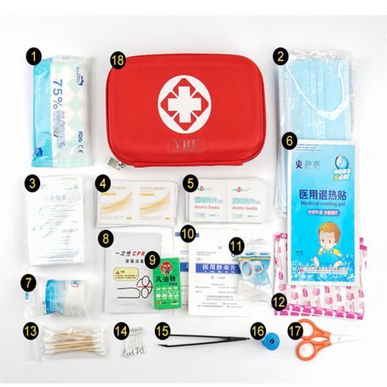 مناديل *10، قناع وجه *5، ضمادة مثلثة *1، أقراص قطنية من اليودوفور *10، أقراص كحول *20، رقعة حرارية *1، ضمادة مرنة من البولي بروبيلين بيوتيلين *1، قناع الإنعاش القلبي الرئوي *1، خلاصة زيت الرياح *1، ضمادة شاش *2، شريط لاصق *1، ضمادة لاصقة *12، مسحة قطنية *1، دبوس أمان *10، ملقط *1، عاصبة *1، مقص *1، مجموعة الإسعافات الأولية *1